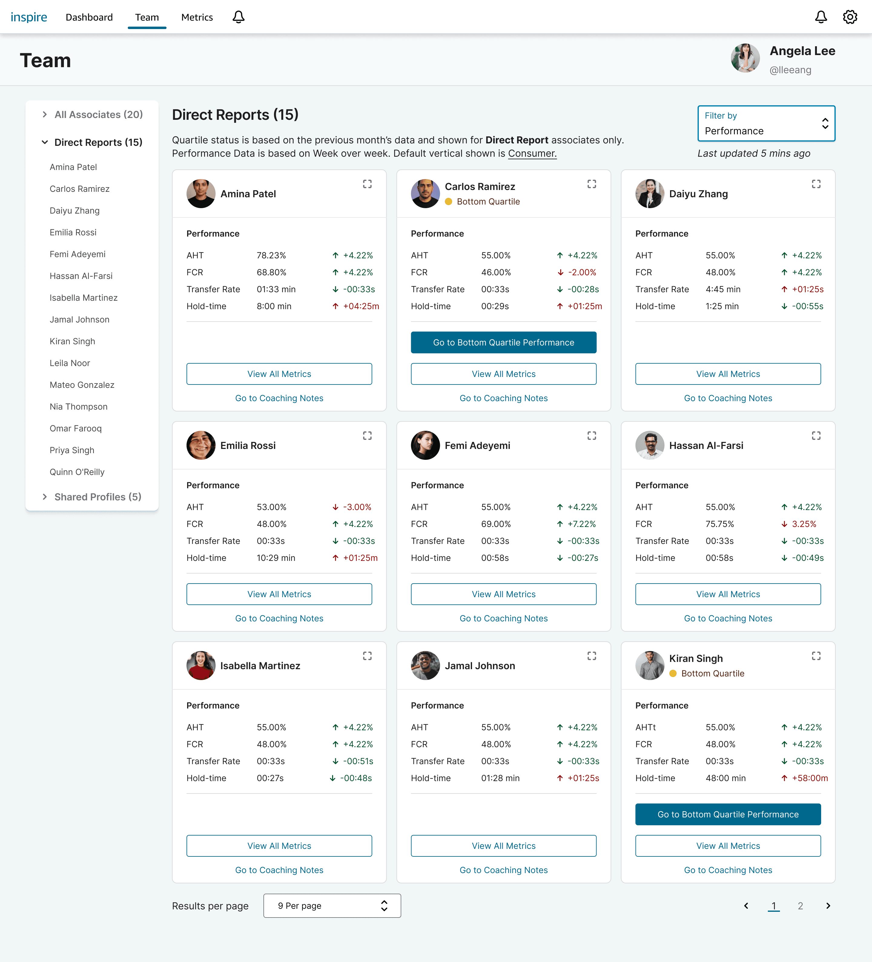 Inspire is Amazon’s internal customer service management platform that helps Team Managers (TMs) monitor team performance and support their Customer Service Associates (CSAs). TMs can track performance metrics, spot areas for improvement, and support associates through tools like coaching and contact reviews so that their they improve the quality of their services. I overhauled the Team page, transforming how Team Managers view and act on associate performance.